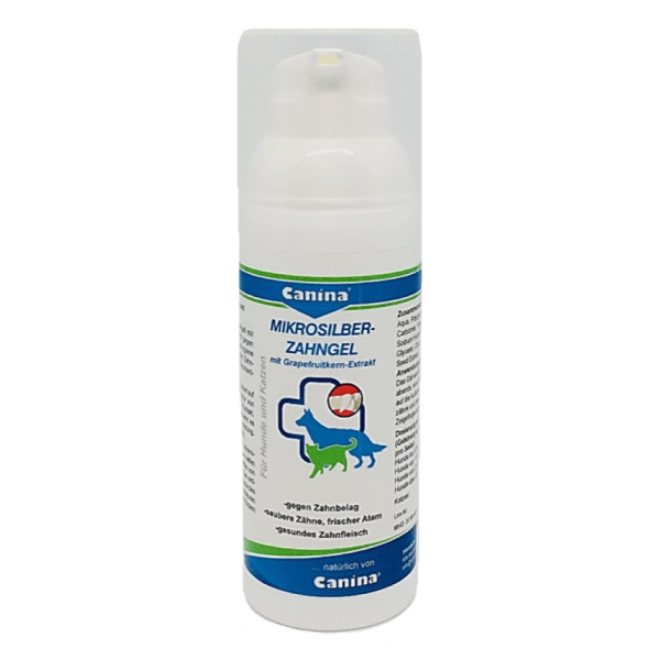 Canina® MIKROSILBER-ZAHNGEL mit Grapefruitkern-Extrakt wirkt gegen die Hauptprobleme der Maulhygiene bei Hund und Katze, wie gegen Zahnbelag, Zahnstein und Zahnfleischentzündungen.Die zahnreinigende Wirkung basiert auf einer gut verträglichen Rezeptur von Mikrosilber und Grapefruitkern-Extrakt. Bei regelmäßiger Anwendung wirkt es effektiv gegen Zahnstein-Neubildung. Ein Abschlucken ist ungefährlich. Die Bioflavonoide im Grapefruitkern-Extrakt wirken anti-oxidativ. Sie helfen den Zähnen, sich vor den Angriffen von Plaque-Keimen zu schützen. Das enthaltene Vitamin C unterstützt gesundes Zahnfleisch, die Amino- und Fettsäuren aus dem Grapefruitkern-Extrakt fördern die Lösung des Zahnbelages.